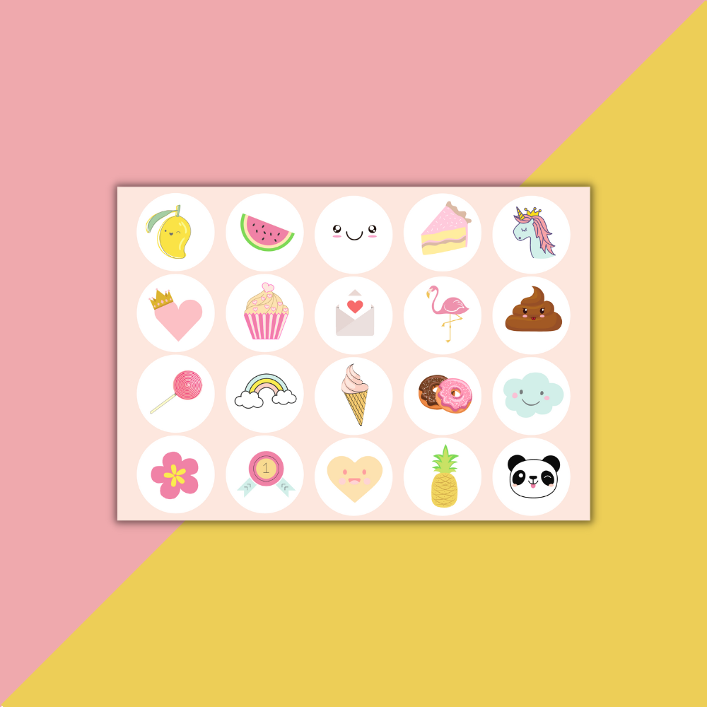 - 20 Sticker cards (10x double-sided, A5 format), varying from 3, 5, 7 to 9 boxes
